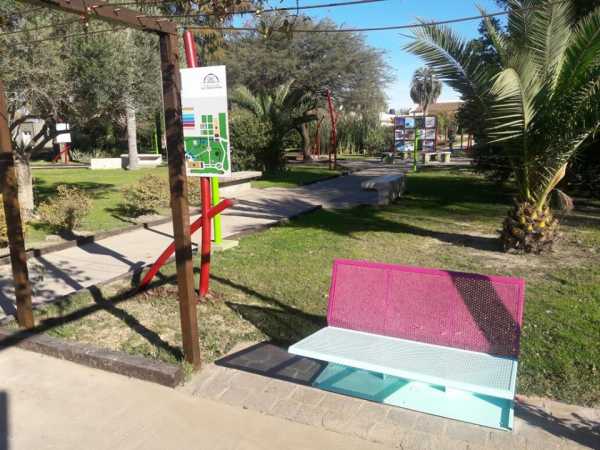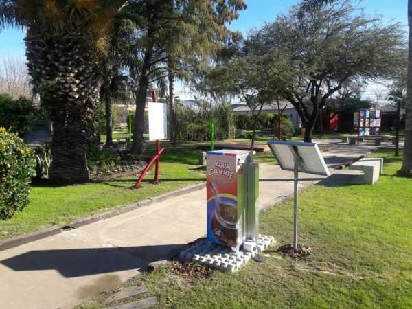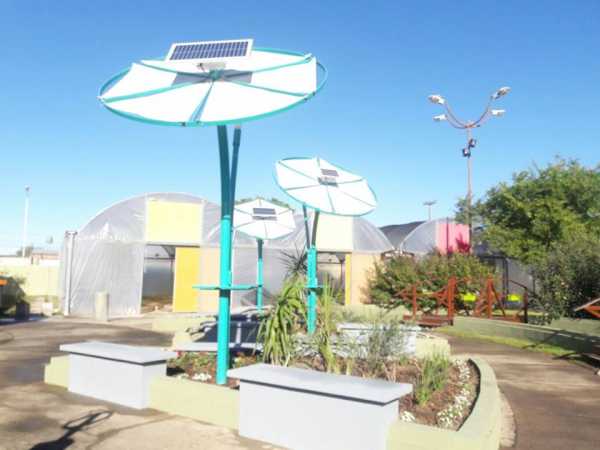 - Energía Fotovoltaica (en el termo matero y en las columnas-sombrillas con paneles que suministran energía para la carga de baterías de equipos electrónicos y celulares).