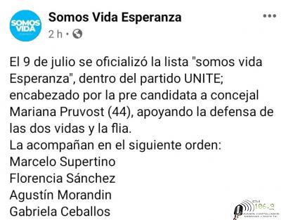 Al no salir unos dias con la actualización de la Pagina hoy damos a conocer esta nueva alternativa para elegir en el cuarto oscuro la que encabeza Mariela Pruvost aqui quienes conforman la lista ."Somos Vida Esperanza"