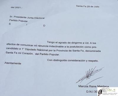 Dio a conocer mediante una nota a las autoridades de las elecciones de Sta Fe que se baja de la lista que habia anunciado
