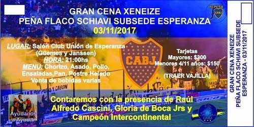 Bosteros de Esperanza y toda la zona, a partir del viernes 1° de setiembre ya estarán disponibles en nuestro local de calle Alvear 1281 de nuestra ciudad las tarjetas para la segunda "Gran Cena Xeneize" que realizaremos el viernes 3 de noviembre y así compartir excelentes y muy gratos momentos con Bosteros de toda la provincia y poder apreciar y escuchar a Raúl Alfredo Cascini, no sólo eso, también copas internacionales y locales y a su vez podremos ayudar entre todos a AVIM, institución Esperancina que realiza un arduo trabajo con enfermos oncológicos de bajos recursos. Dale pedi la tuya a integrantes de la Peña en Esperanza o en San Jerónimo (Oscar Abel Walker). Vamos no te quedes afuera de este gran acontecimiento. (Tarjetas Limitadas)