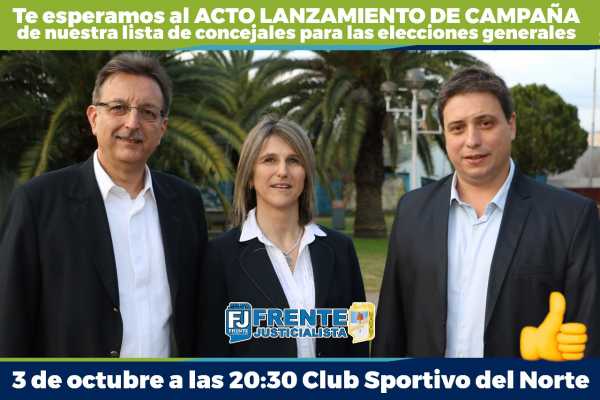 Invito a Usted/es a la conferencia de prensa que se desarrollará el día martes 03 de octubre a la hora 20,30 en las instalaciones del Club Sportivo del Norte, con motivo del lanzamiento de campaña de nuestra lista a concejales para las elecciones generales 2017 , del FRENTE JUSTICIALISTA.