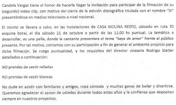 El sábado 21 a la hora 11 en Casa Molina Restó en ruta 70 y Botai se realizará la filmación se invita a participar de la misma .Solicitan no concurrir con ropa rayada y tampoco blanca según pide el director de filmación.