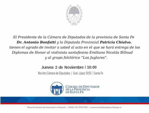 Hola amigos !! Quiero invitarlos este jueves 2 de noviembre en la Cámara de Diputados de la provincia de Santa fe a las 10hs a un homenaje que nos van a hacer a Los Juglares y a mí declarados como Grupo Santafecino Folklórico destacado del año 2017 todo aquel que me quiera acompañar en esta premiación será para mí un placer, al finalizar dicha premiación mini concierto en ceremonial de la cámara !!! Infinitas gracias a Adriana Robledo y a secretaría de Cultura de Esperanza por el apoyo de siempre y por el trabajo exelente !!! Gracias !!! Gracias!!! Por dejarme cumplír mi sueño dijo Emi Billoud.