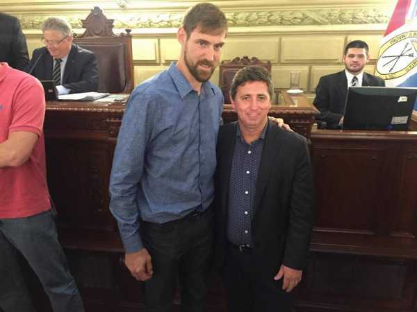 Homenaje al Galvense Andrés Chapu Nocioni en el recinto de la Cámara de Senadores por su destacada trayectoria como persona, deportista e integrante de la generación dorada del básquet argentino.El Senador pirola nos da la dimensión de su estatura en una foto un grande de donde se lo mire.