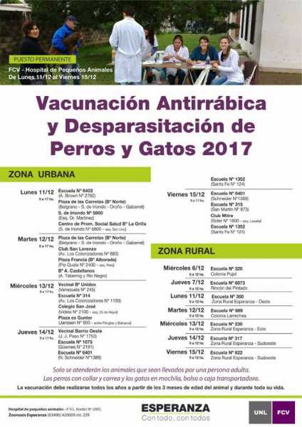 La Municipalidad de Esperanza invita a los ciudadanos a tomar el compromiso de realizar la vacunación de los animales perros y gatos y desparacitación aqui se detallan lugares dias y horarios