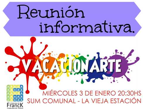 La Dirección de Cultura, Educación y Deporte de la Comuna de Franck les recuerda que hasta el viernes 5 de enero se encuentran abiertas las inscripciones para la colonia de vacaciones de esta temporada 2018 que comenzará el próximo 8 del corriente mes.