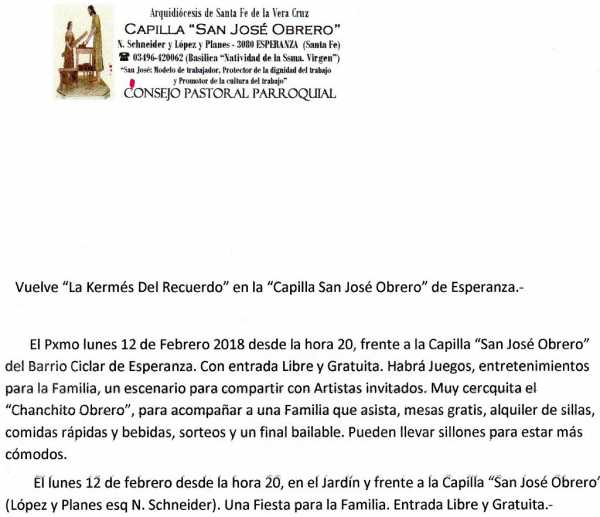 7ma “Kermés del Recuerdo” que organiza la Capilla “San José Obrero” del Barrio Ciclar de Esperanza, programada para el lunes 12 de Febrero (Feriado por Carnaval).
