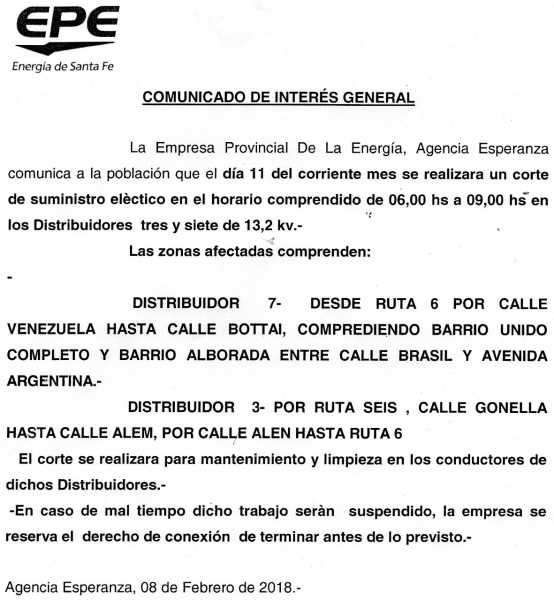 EPE comunica que para el dia 11 de febrero habra cortes en algunos sectores de la ciudad queaqui detallan