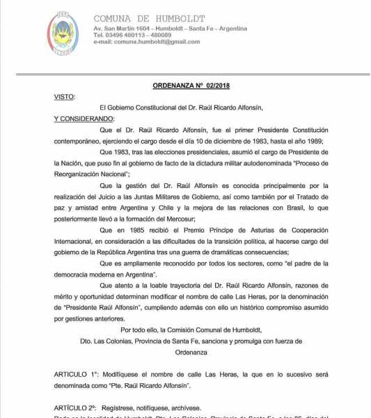 Desde la Comuna de Humboldt informaron que se decretó cambio de nombres a las arterias calle Las Heras por la de Dr Raúl Alfonsin y calle 12 de Octubre por el homenaje a Batistín Salvetti .
