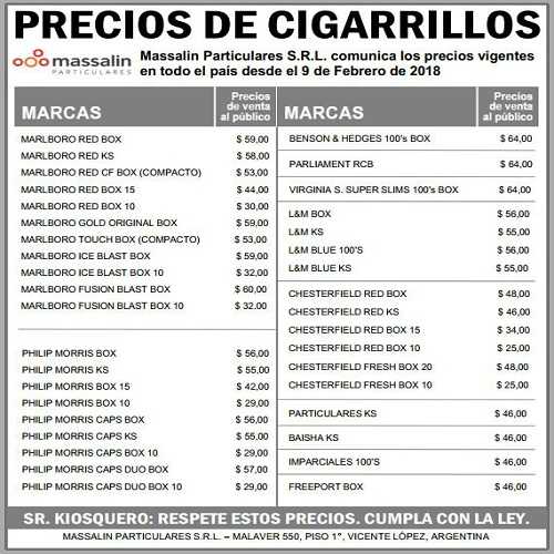La lista completa de precios de los cigarrillos de Massalin Particulares a febrero de 2018: