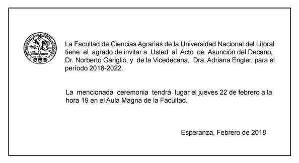 Queda anunciado el acto donde Asumen Decano y Vice Decana en Facultad de Ciencia Agraria periodo 2018-2022 sera el 22 de Febrero a la hora 19 en el aula Magna de Facultad