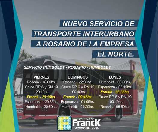 La Comuna de Franck informa que desde el viernes 16 de marzo y por un período de tres meses de prueba la Empresa El Norte comenzará con el servicio de transporte interurbano a la ciudad de Rosario los días viernes, domingo y lunes.