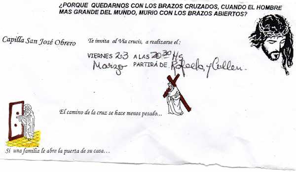 El viernes rezo del Via Crucis en la Capilla San José Obrero a las 19 Hs en la Capilla y dentro del Via Crucis Barrial, partirá el viernes a las 20,30 desde la esquina de Rafaela y Cullen