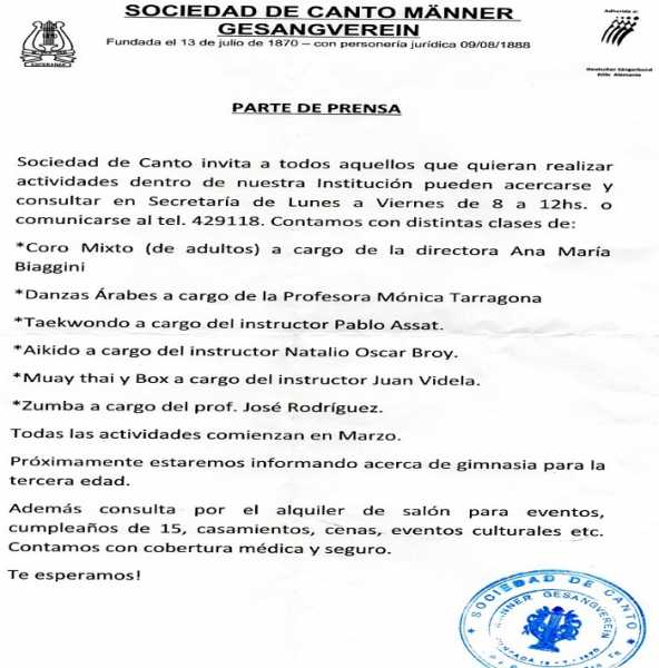 Sociedad de Canto invita a desarrollar actividades en la institución