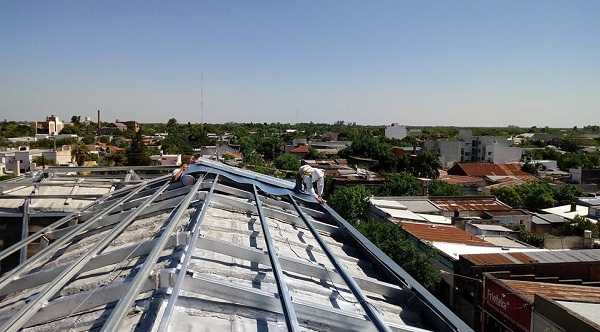 Aprovechando la jornada de tiempo bueno hoy con una grua especial se fueron elevando las chapas para comenzar a techar este edificio.
