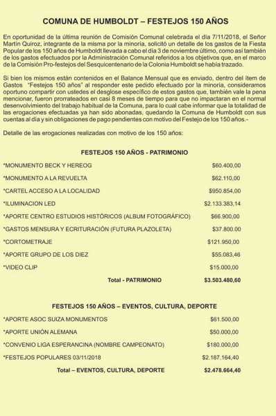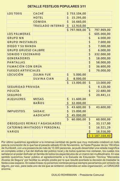 La comuna dio a conocer el balance de los gastos que se realizaron para la celebración de los 150° años de la localidad de Humboldt