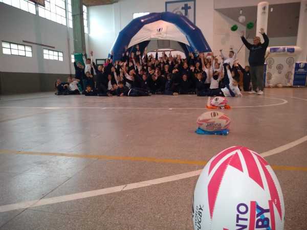 Chicos y chicas de la institución educativa disfrutaron de inflables para aprender rugby, juegos lúdicos y otras actividades inherentes al deporte.
