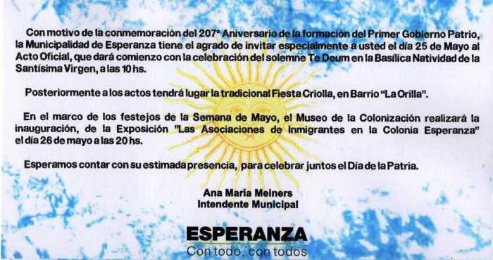 La Municipalidad de Esperanza por medio de la secretaria de Cultura invita a participar de los actos del 25 de Mayo