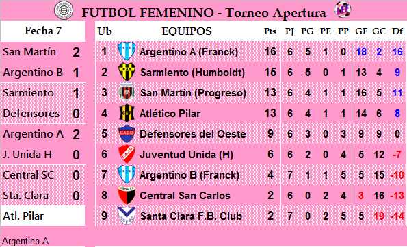 En cancha de Sarmiento de Humboldt se disputó la séptima fecha del Torneo Apertura, con los siguientes resultados y tabla de posiciones.VER RESULTADOS Y POSICIONES OPRIMIENDO IMAGEN PRINCIPAL