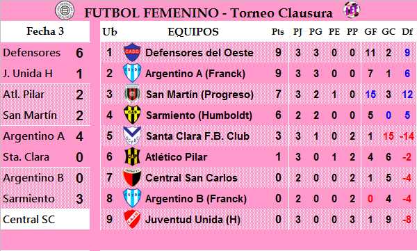 El Estadio Emiliano Sala de San Martín de Progreso fue testigo de la tercera fecha del Torneo Clausura del Fútbol Femenino LEF. Aquí te dejamos los resultados finales y la tabla de posiciones. VER RESULTADOS Y POSICIONES OPRIMIENDO FOTO PRINCIPAL
