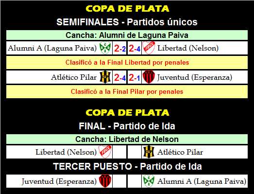 Atlético Pilar y Libertad de Nelson son los Finalistas de la Copa de Plata. Ambos clubes eliminaron a sus rivales de turno a través de los penales. Pilar a Juventud de Esperanza y Libertad a Alumni A de Laguna Paiva.