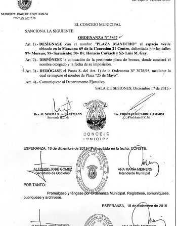 El viernes 30 de Junio hora 11 la Municipalidad cambiara el nombre a la placita 25 de Mayo ubicada en Barrio la Orilla  este cumplimiento ante solicitud al  Concejo que habia aprobado este  decreto el 17 de Diciembre 2015 en esa oportunidad lo habiamos notificado en pagina web y hoy volvemos a emitirlo. La familia de  Manucho Venturini en agradecimiento entregara presente al Jardin de Infante